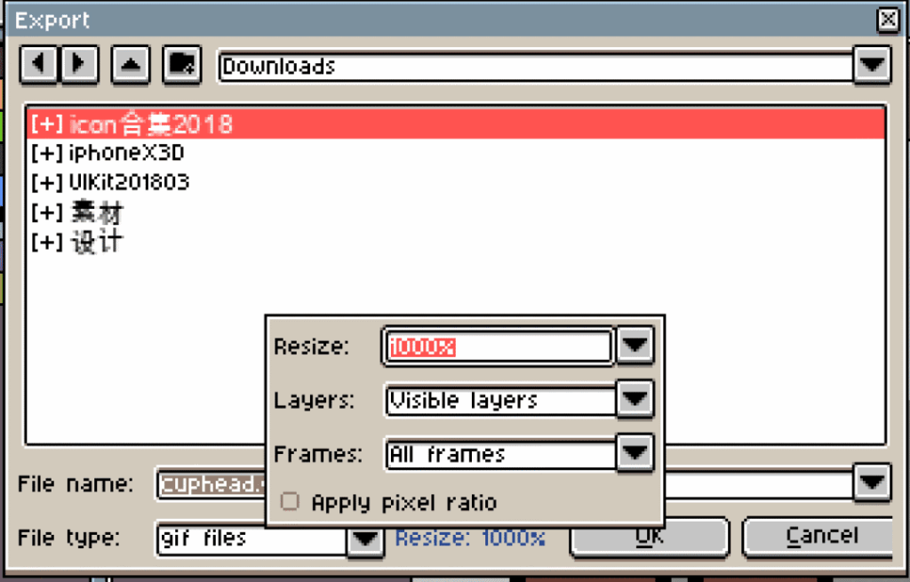 紧跟着是Resize:100%,这是一个非常方便的放大功能,可以将像素画无损放大100%-1000%。我选择放大1000%,动画尺寸是3232像素,放大1000%就是320320像素。因为有放大,所以使用像素画开发的游戏,美术成本相对于其他原画类2D游戏会比较低。Layers是可以选择导出的图层,Visible layers是导出所有可见图层。Frames:All frames是导出所有的帧。如果需要展示静态的像素画就可以选择Selected frame,即当前选中的帧。这个功能在制作教程的时候非常方便。