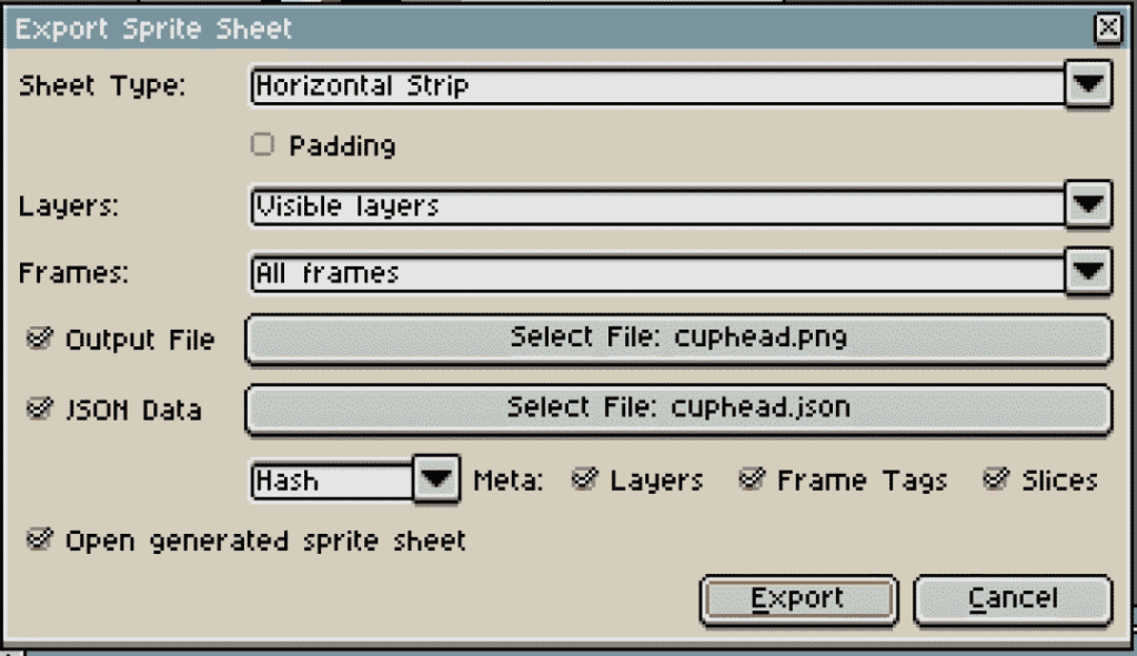 在弹出的窗口勾选Output File,JSON Data,Open generated sprite sheet。点击Export后会自动生成包含所有帧的图片和JSON数据。注意哦,这里导出的帧是原始大小。